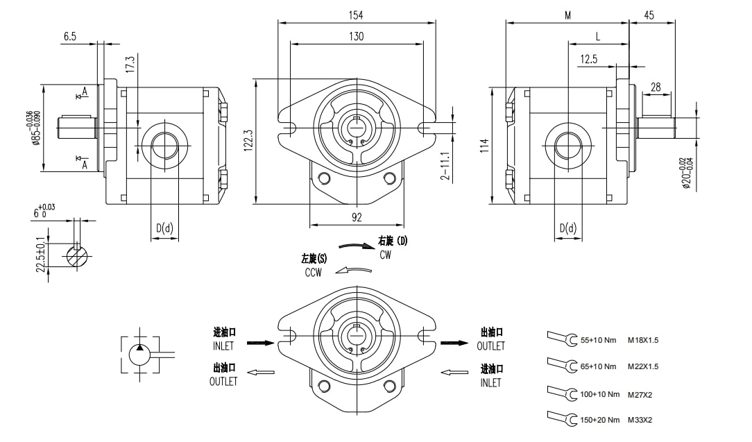 | 12.5 | 250 | 270 | 290 | 4000 | 800 | 4.3 | 113 | 54.8 | Z0 | M22x1.5 | M18x1.5 |