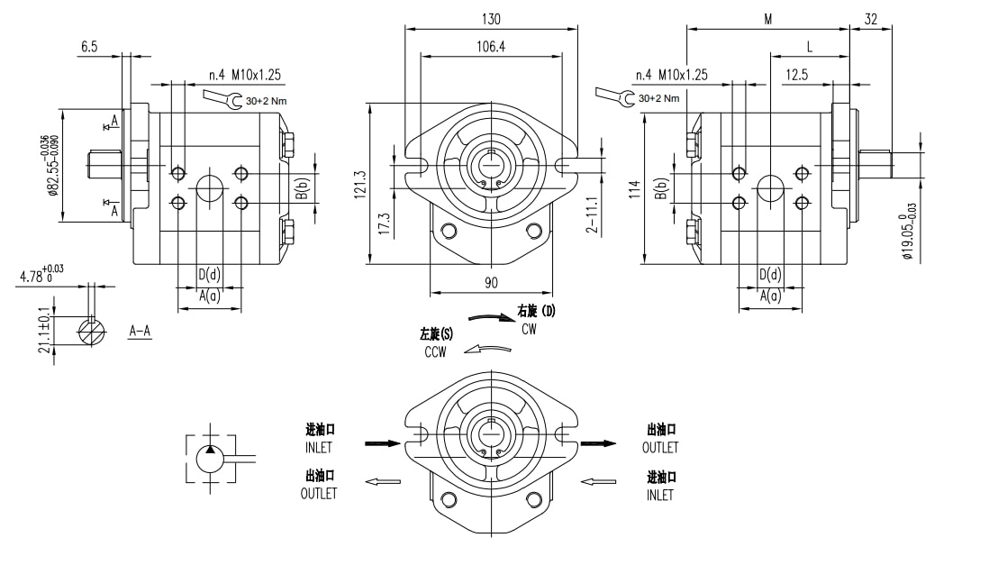 | Deslocamento | Pressão máxima | Velocidade máxima | Velocidade mínima | Peso | Dimensões | Código de porta de óleo | Entrada | Saída | |||||||||