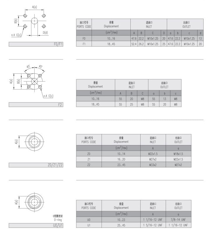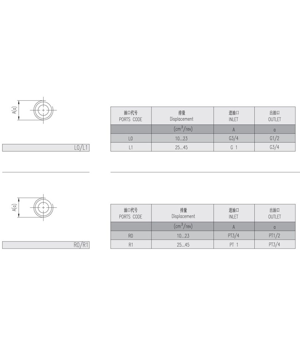 | Deslocamento | Pressão máxima | Velocidade máxima | Velocidade mínima | Peso | Dimensões | Código de porta de óleo | Entrada | Saída | |||