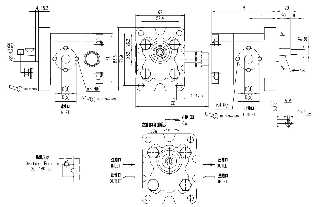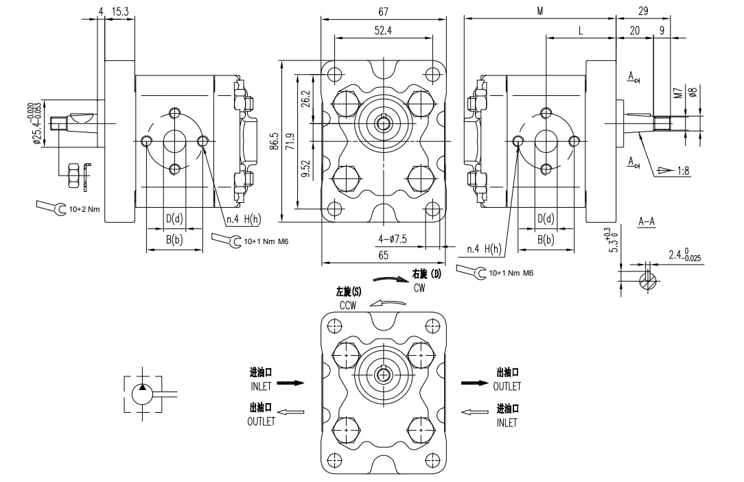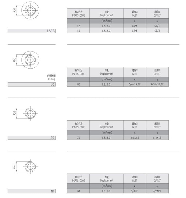 | Deslocamento | Pressão máxima | Velocidade máxima | Velocidade mínima | Peso | Dimensões | Código de porta de óleo | Entrada | |||