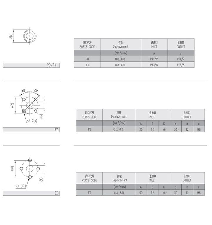 | Deslocamento | Pressão máxima | Velocidade máxima | Velocidade mínima | Peso | Dimensões | Código de porta de óleo | Entrada | Saída | ||||
