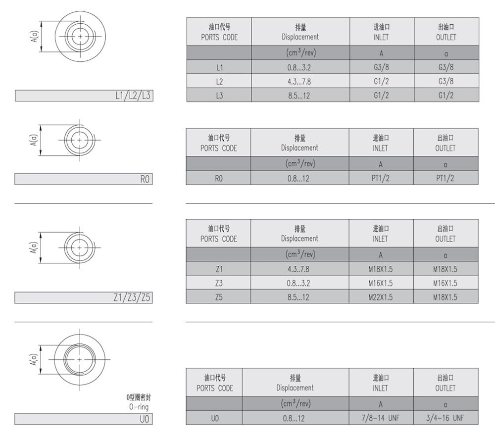 | Deslocamento | Pressão máxima | Velocidade máxima | Velocidade mínima | Peso | Dimensões | Código de porta de óleo | Entrada | Saída | ||||
