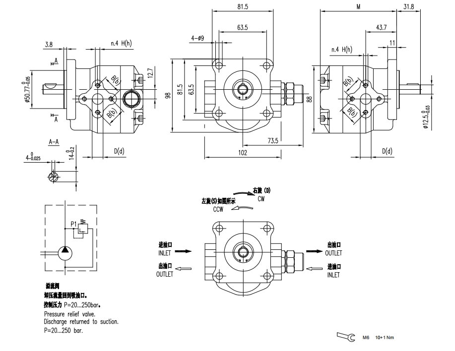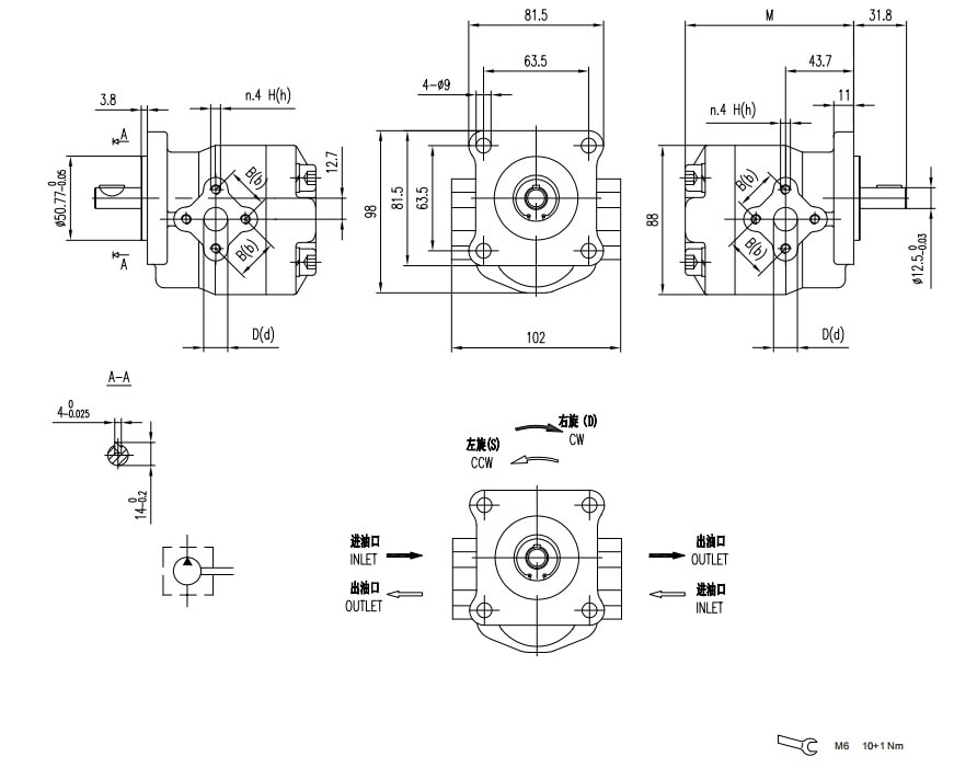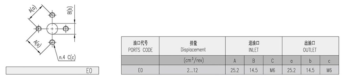 | Deslocamento | Pressão máxima | Velocidade máxima | Velocidade mínima | Peso | Dimensões | Código de porta de óleo | Entrada D | Saída d | |||||||