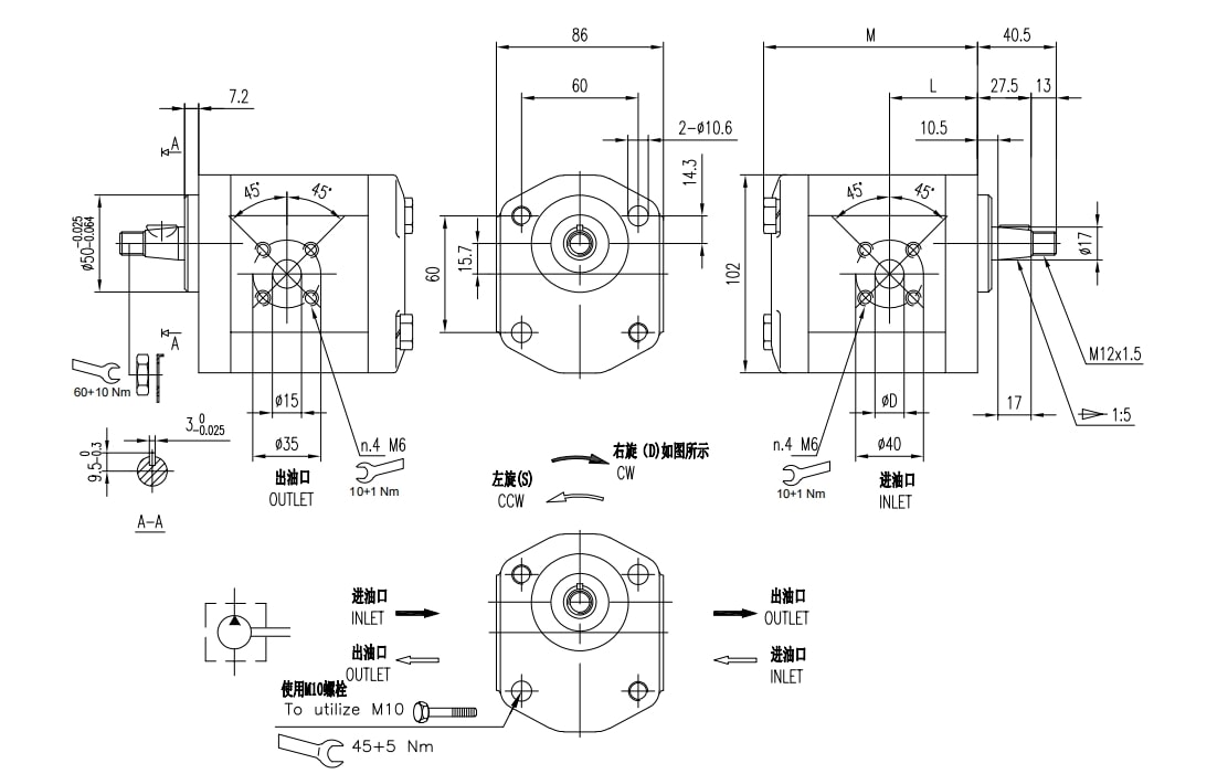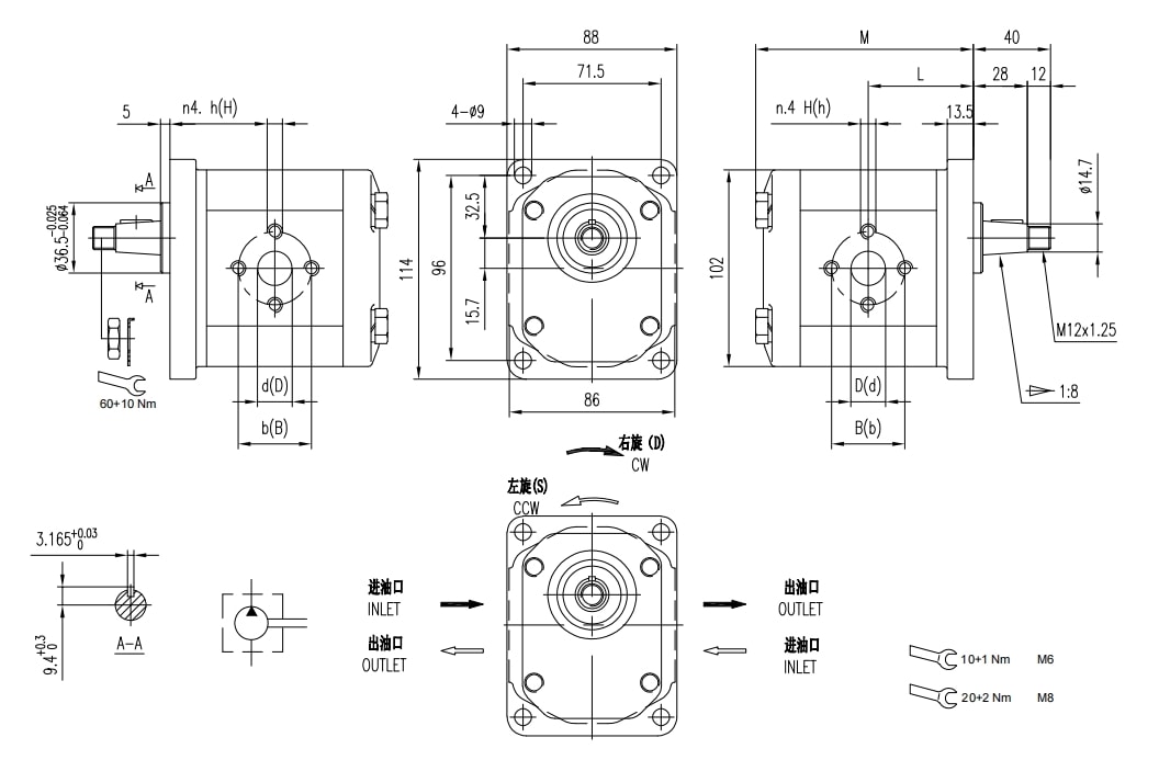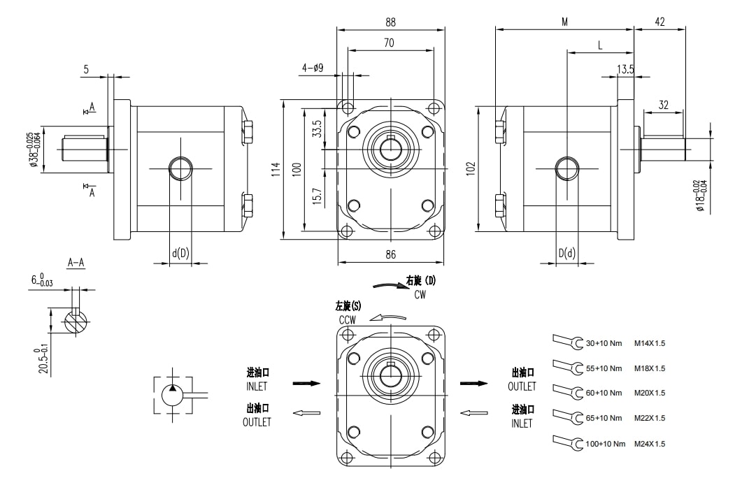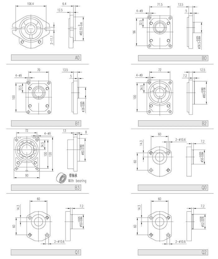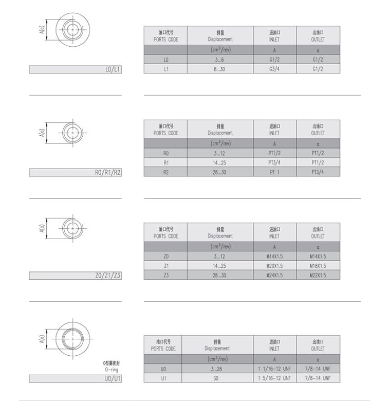 |  Deslocamento |   Pressão máxima	 |   Velocidade máxima |  Velocidade mínima |   Peso | 	  Dimensões |   Código de porta de óleo	  |   Entrada |   Saída |