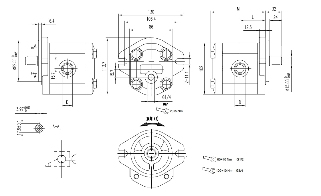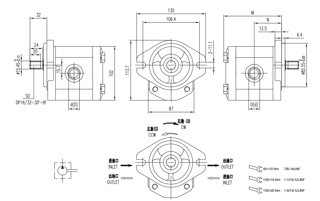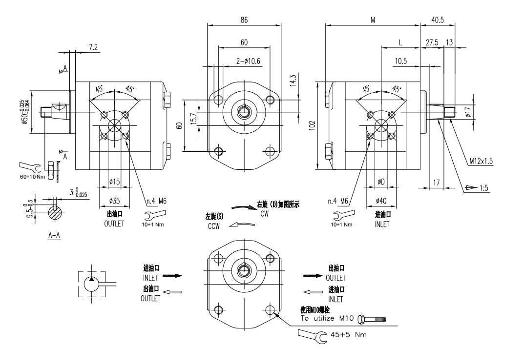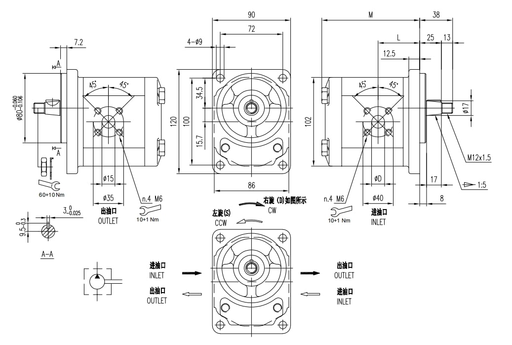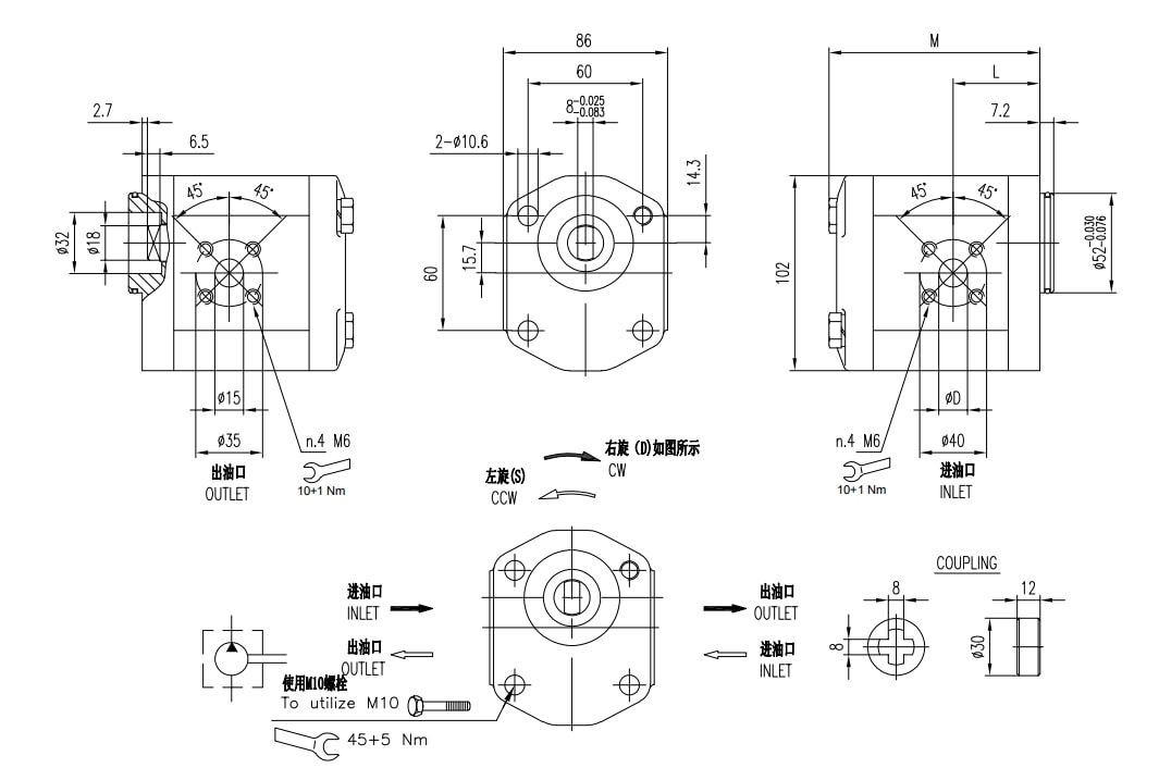 |  Deslocamento |   Pressão máxima	 |   Velocidade máxima |  Velocidade mínima |   Peso | 	  Dimensões |   Código de porta de óleo	  |   Entrada |   Saída |