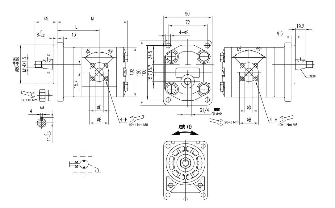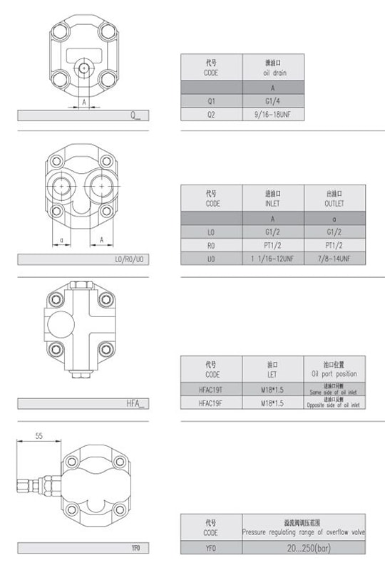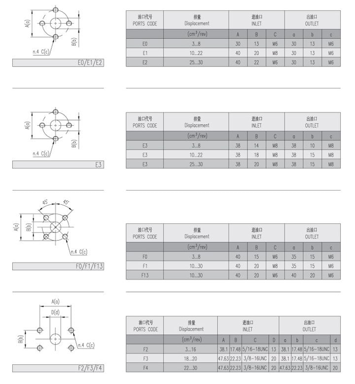 |  Deslocamento |   Pressão máxima	 |   Velocidade máxima |  Velocidade mínima |   Peso | 	  Dimensões |   Código de porta de óleo	  |   Entrada |