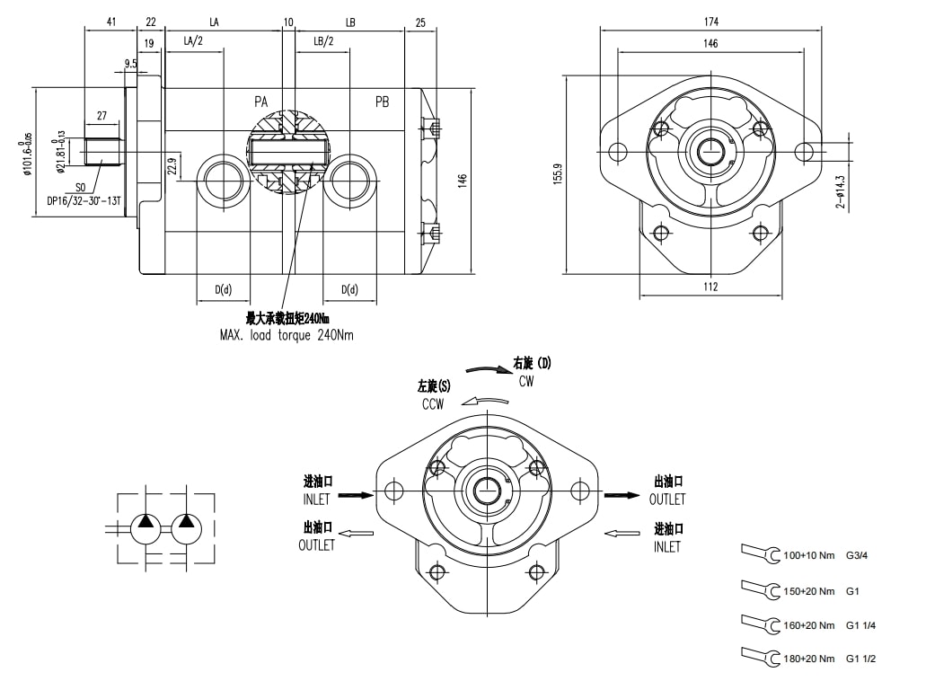 |  Deslocamento |   Pressão máxima	 |   Velocidade máxima |  Velocidade mínima |   Dimensões |   Código de porta de óleo	  |   Entrada |   Saída |   Código de porta de óleo	  |   Entrada |   Saída |