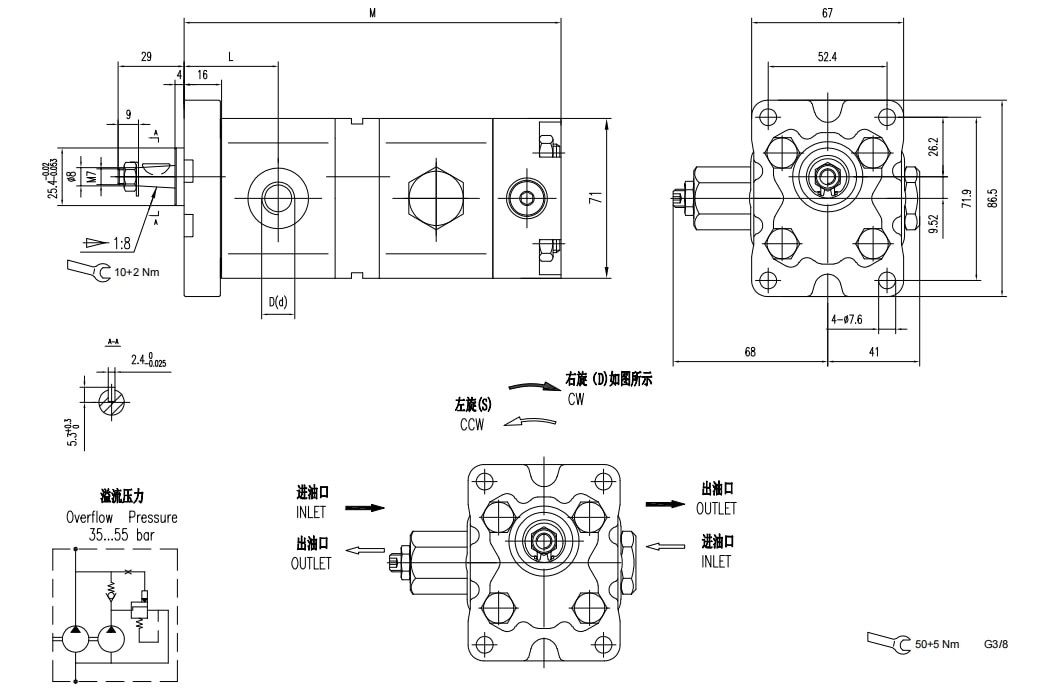 | Deslocamento |  Pressão máxima |  Pressão de transbordamento |  Velocidade máxima |  Velocidade mínima |  Dimensões |  Código da porta de óleo |  Entrada |  Saída |