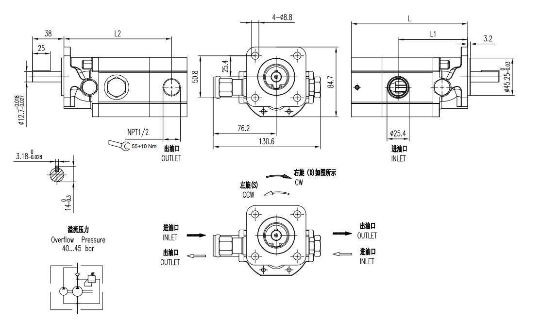 Dimensões padrão do produto com bomba alta-baixa pressão 1.3 G/1.3 G