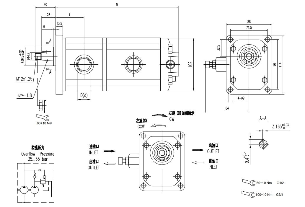 | Deslocamento |  Pressão máxima |  Pressão contínua máxima |  Velocidade máxuma |  Velocidade mínima |  Dimensões |  Código da porta de óleo |  Entrada |  Saída |